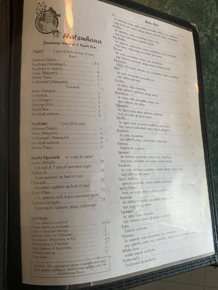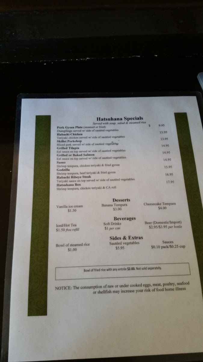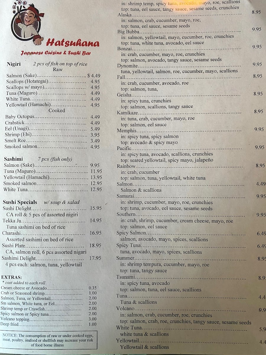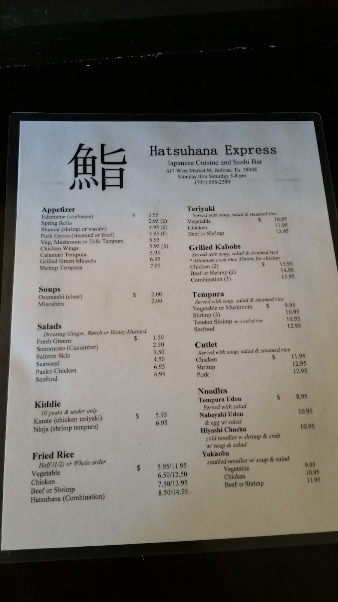 From a reviewer’s perspective, Hatsuhana Express offers an extensive menu that balances comfort and variety, making it easy for diners to mix familiar favorites with more adventurous choices. Starters like Edamame, Spring Rolls, Shumai, Pork Gyoza, and Calamari Tempura set a satisfying tone, while soups such as Clear Osumashi and Misoshiru and fresh salads like Fresh Greens, Sunomono, Salmon Skin, Seaweed, and Panko Chicken keep things light and refreshing. Heartier options come through in the noodle bowls-Tempura Shrimp Udon and Nabeyaki Udon & Egg-as well as customizable fried rice dishes, whether Vegetable, Chicken, Beef or Shrimp, or the signature Hatsuhana. Families will appreciate kid-friendly plates like Karate and Ninja, while generous sides such as Bowl Steamed Rice, Bowl Plain Fried Rice, Bowl Veg Fried Rice, Bowl 1 Meat Fried Rice, and Bowl Combo Meat Fried Rice make meals easy to tailor. The Pork Gyoza Plate, Habachi Chicken, Skillet Porkchop, Grilled Tilapia, and Grilled or Baked Salmon highlight the Hatsuhana Specials, complemented by sweet finishes like Vanilla Ice Cream, Banana Tempura, and Cheesecake Tempura. Sushi lovers will find a wide selection, from cooked items like Baby Octopus, Crabstick, Eel, Shrimp, and Smelt Roe, to sashimi options including Salmon, Tuna, Yellowtail, Smoked Salmon, and White Tuna. The restaurant’s sushi specials-Sushi Delight, Tekka Ju, Charashi, Sushi Plate, and Sashimi Delight-pair well with both raw rolls like 911, Alaska, Big Bubba, Bonzai, and Dynomite, and cooked rolls such as Bayou, Bolivar, Califor