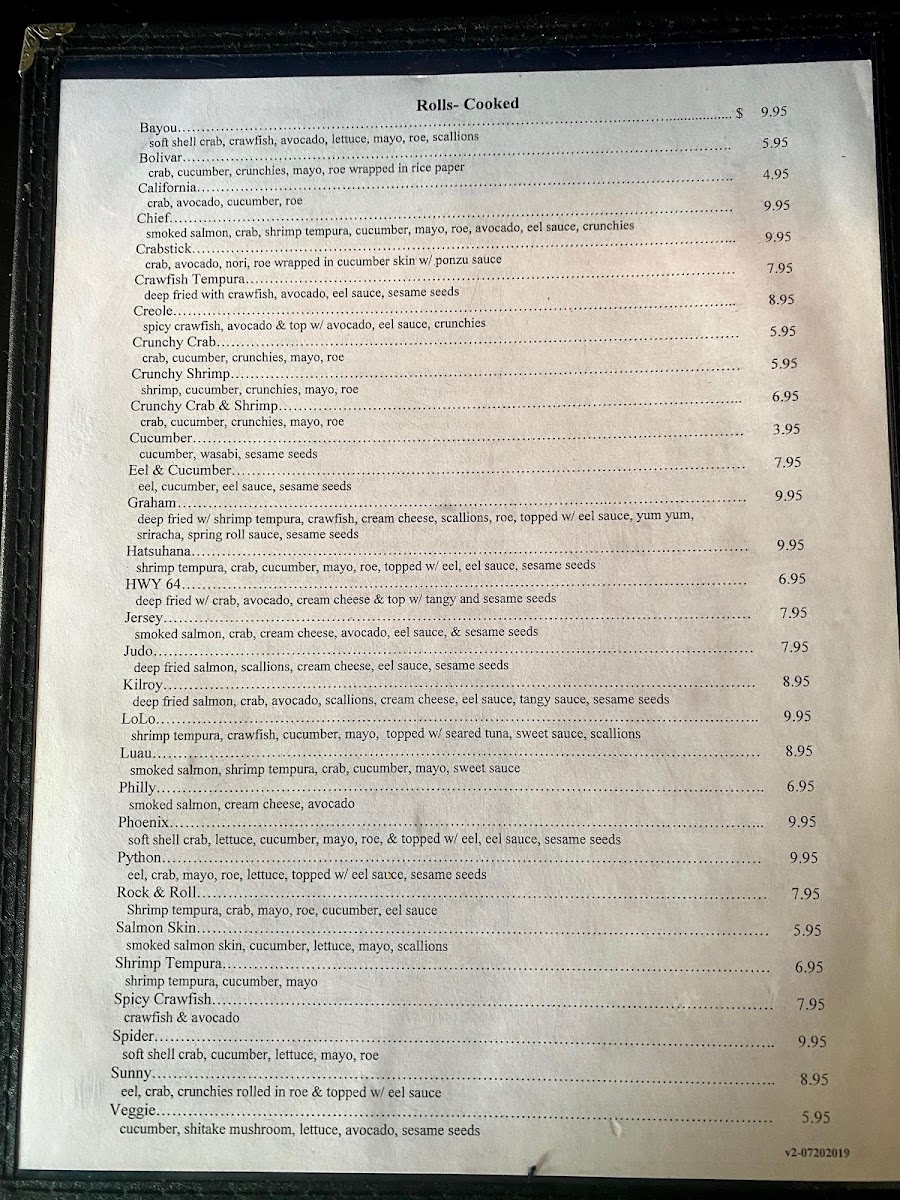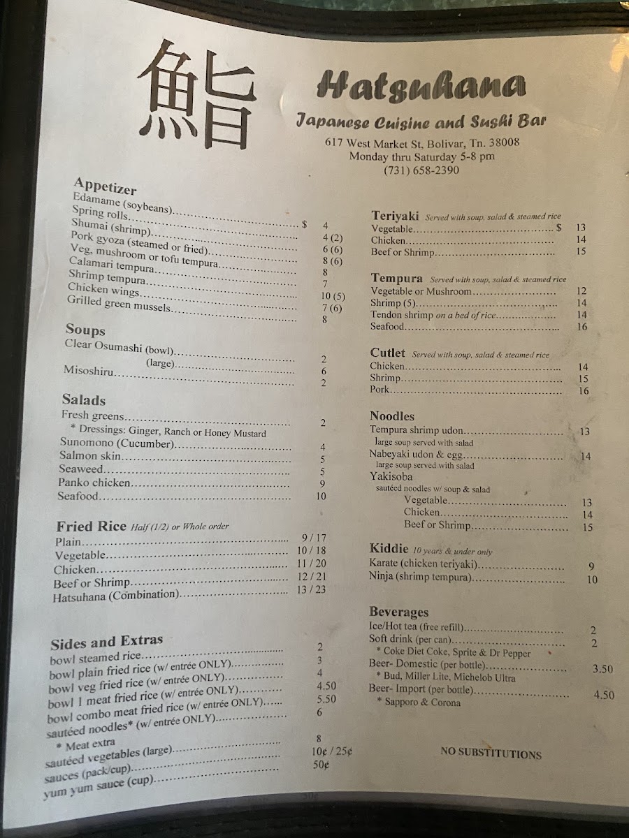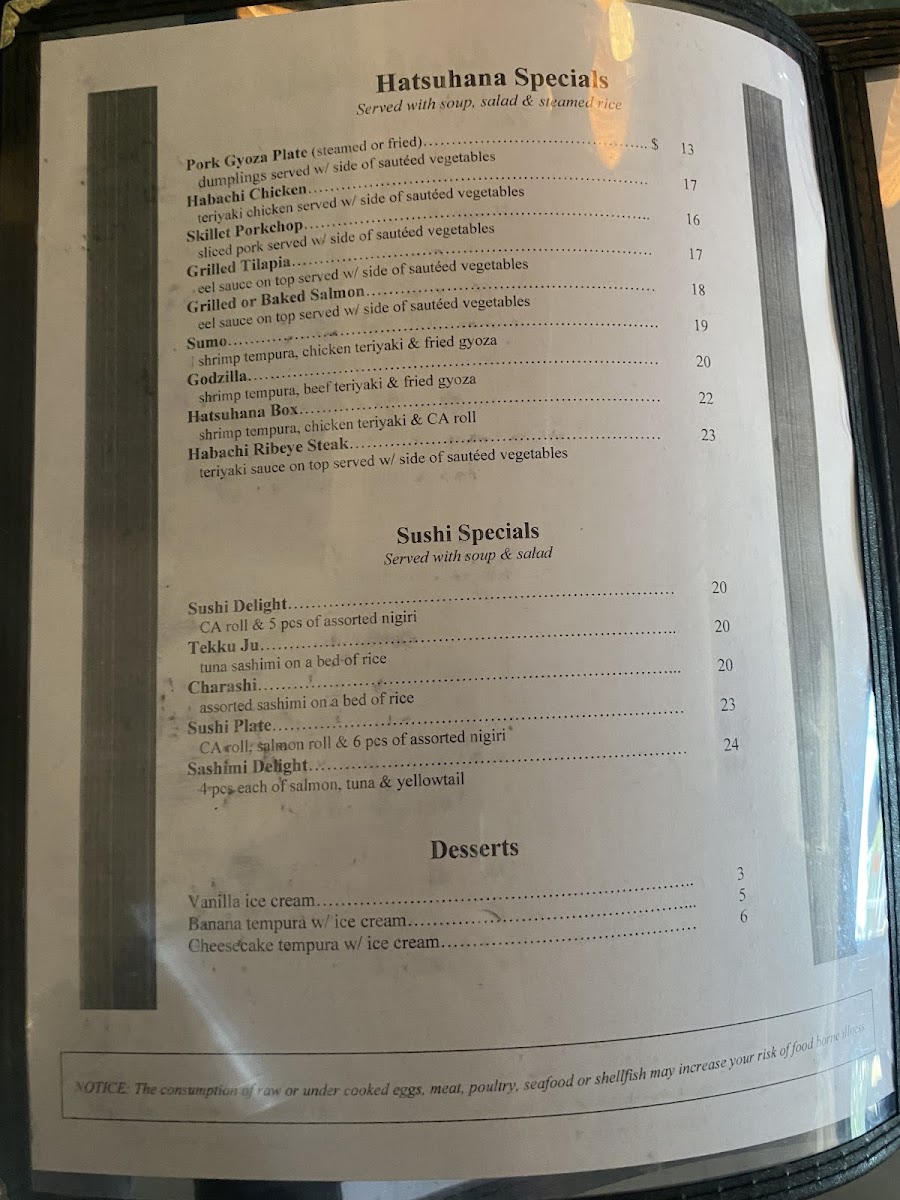 From a reviewer’s perspective, Hatsuhana Express offers an extensive menu that balances comfort and variety, making it easy for diners to mix familiar favorites with more adventurous choices. Starters like Edamame, Spring Rolls, Shumai, Pork Gyoza, and Calamari Tempura set a satisfying tone, while soups such as Clear Osumashi and Misoshiru and fresh salads like Fresh Greens, Sunomono, Salmon Skin, Seaweed, and Panko Chicken keep things light and refreshing. Heartier options come through in the noodle bowls-Tempura Shrimp Udon and Nabeyaki Udon & Egg-as well as customizable fried rice dishes, whether Vegetable, Chicken, Beef or Shrimp, or the signature Hatsuhana. Families will appreciate kid-friendly plates like Karate and Ninja, while generous sides such as Bowl Steamed Rice, Bowl Plain Fried Rice, Bowl Veg Fried Rice, Bowl 1 Meat Fried Rice, and Bowl Combo Meat Fried Rice make meals easy to tailor. The Pork Gyoza Plate, Habachi Chicken, Skillet Porkchop, Grilled Tilapia, and Grilled or Baked Salmon highlight the Hatsuhana Specials, complemented by sweet finishes like Vanilla Ice Cream, Banana Tempura, and Cheesecake Tempura. Sushi lovers will find a wide selection, from cooked items like Baby Octopus, Crabstick, Eel, Shrimp, and Smelt Roe, to sashimi options including Salmon, Tuna, Yellowtail, Smoked Salmon, and White Tuna. The restaurant’s sushi specials-Sushi Delight, Tekka Ju, Charashi, Sushi Plate, and Sashimi Delight-pair well with both raw rolls like 911, Alaska, Big Bubba, Bonzai, and Dynomite, and cooked rolls such as Bayou, Bolivar, Califor